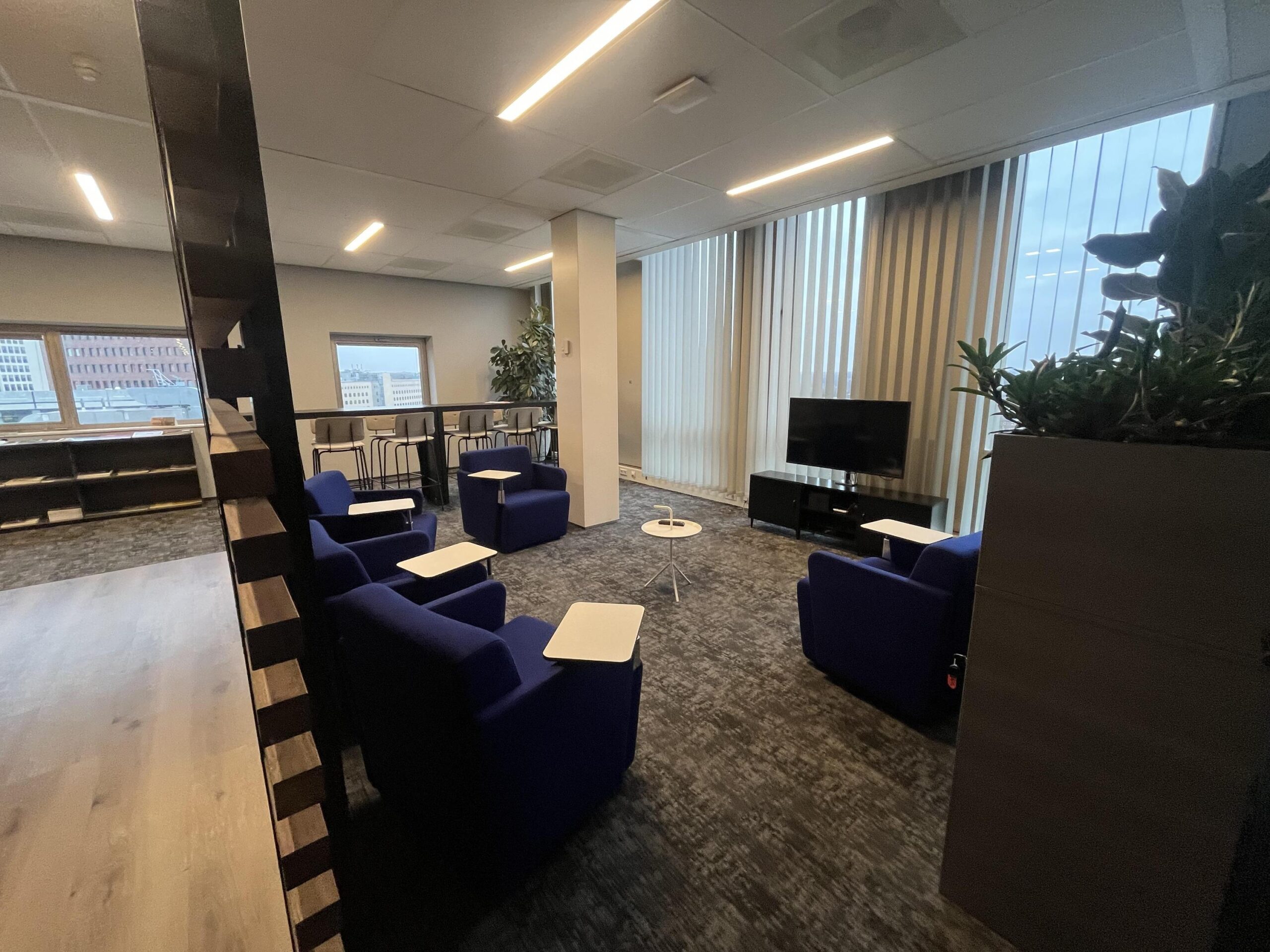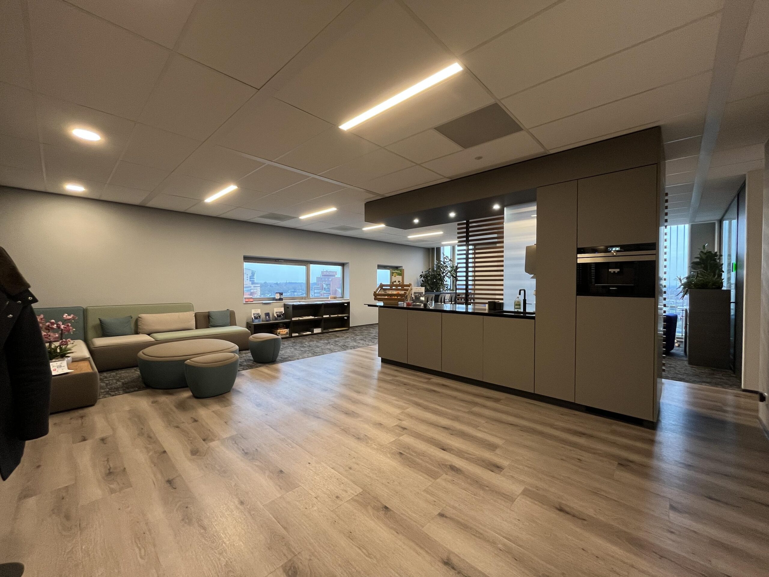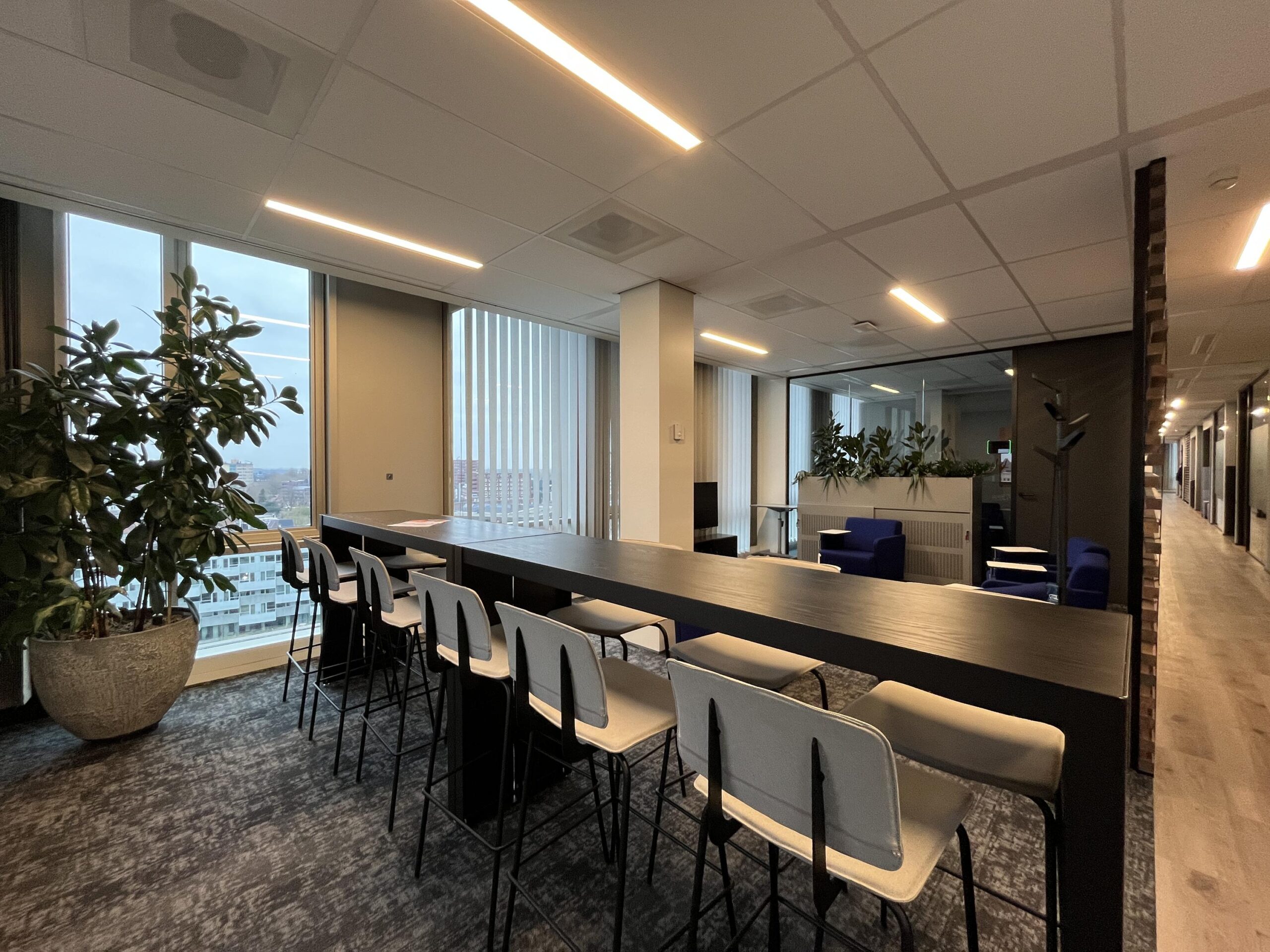 Op de 8e verdieping is een ruimte van circa 171 m2 v.v.o. beschikbaar in de onderverhuur met een modern inbouwpakket. De ruimte bestaat uit een open ruimte en een gemeenschappelijk gedeelte met een pantry, lunchruimte en twee vergaderruimtes.