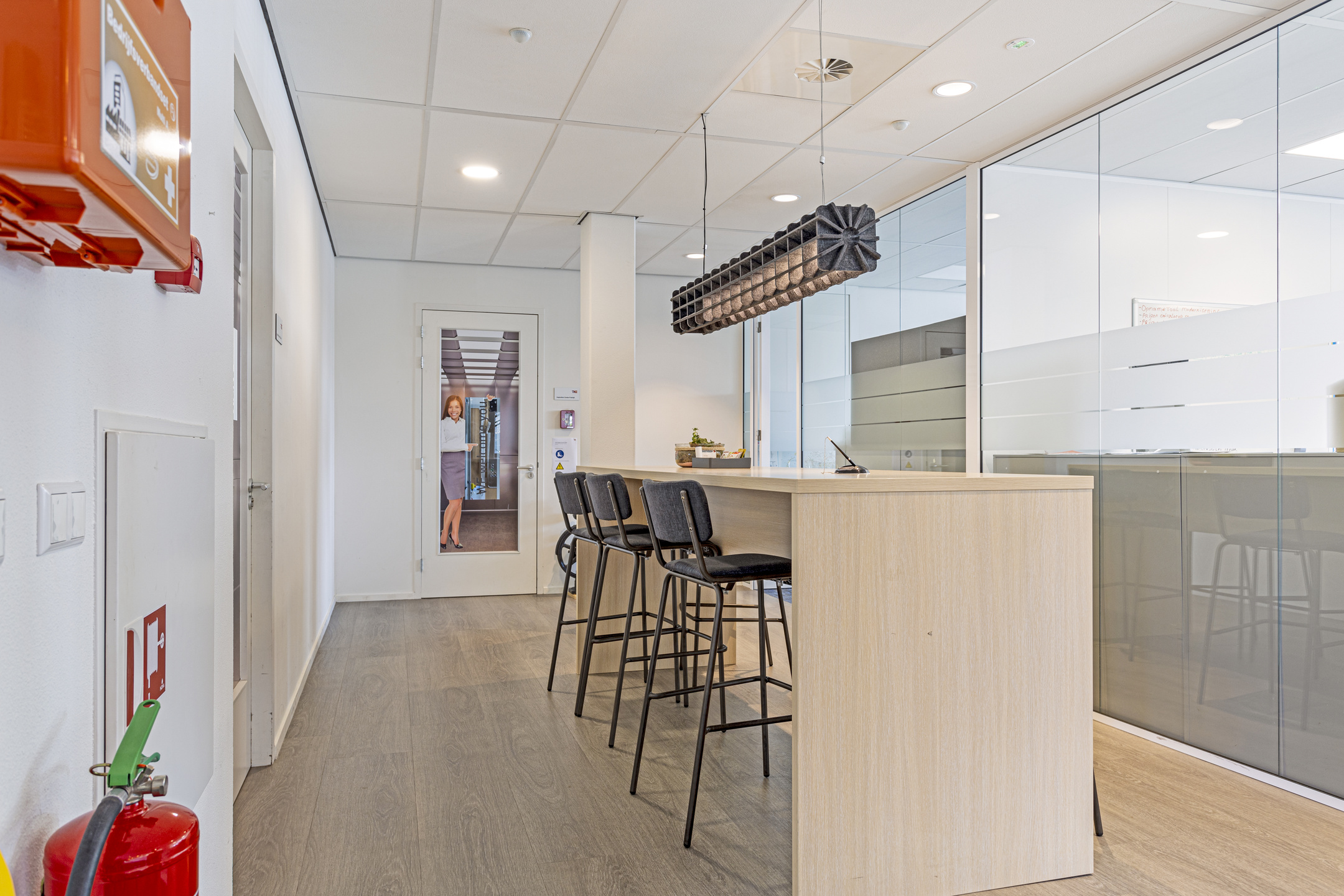 In aanvulling op voornoemde wijze van oplevering zal de kantoorruimte worden opgeleverd voorzien van het door vertrekkend huurder aangebrachte hoogwaardige inrichtingspakket, bestaande uit onder meer: