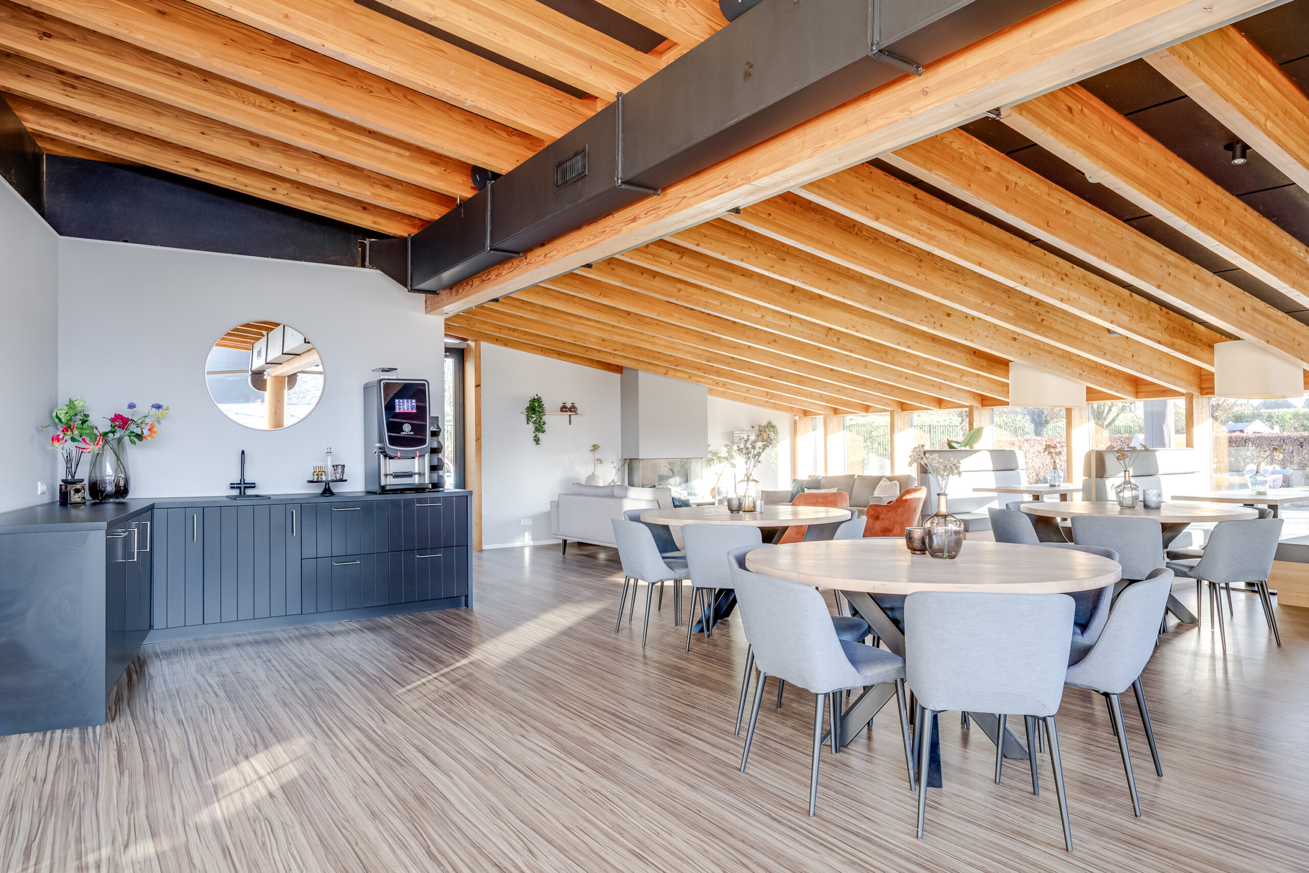 Voorts is op de begane grond een geheel ingerichte horecaverblijfsruimte met zitplaatsen en een professionele keuken met koelcel.
