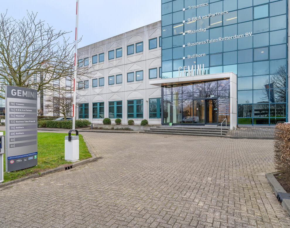 Te huur, kantoorgebouw Gemini, gelegen aan de K.P. van der Mandelelaan 64-78 te Rotterdam. Het gebouw omvat in totaal ca. 2.509 m² v.v.o. kantoorruimte, verdeeld over 4 lagen. Voor verhuur is thans gehele object beschikbaar in units vanaf 435,2 m² v.v.o. Het gebouw heeft een gunstige parkeernorm van 1 parkeerplaats per circa 45 m² kantoorruimte.