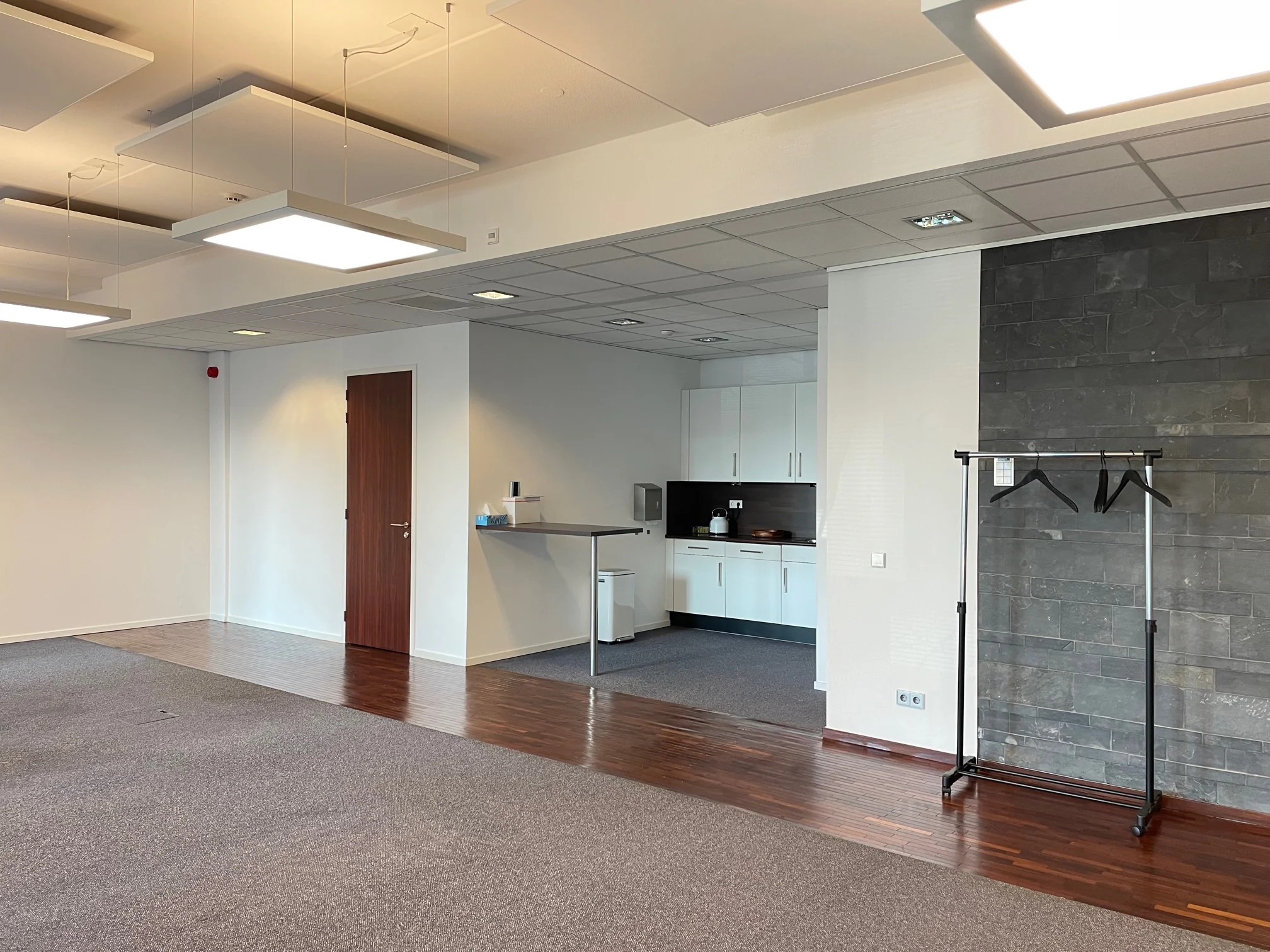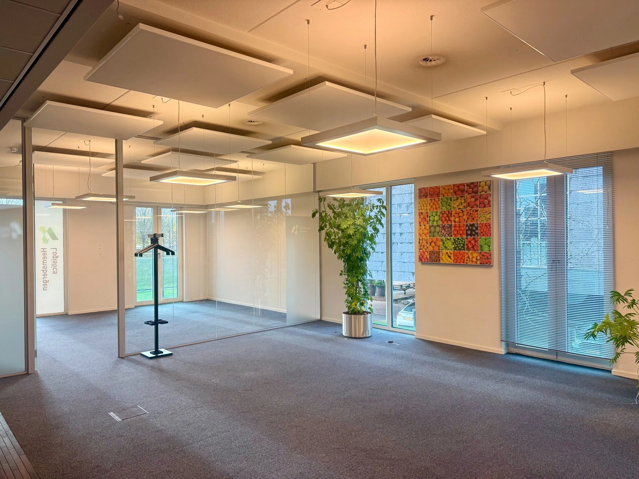 • vloerbedekking, gescheiden kantoor met glazen wand en separate berging;