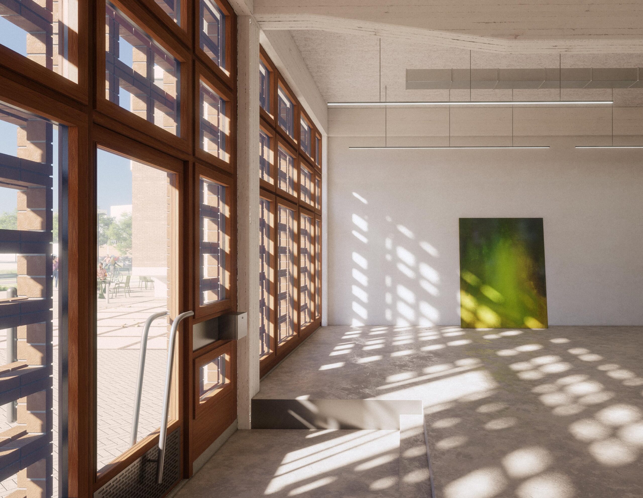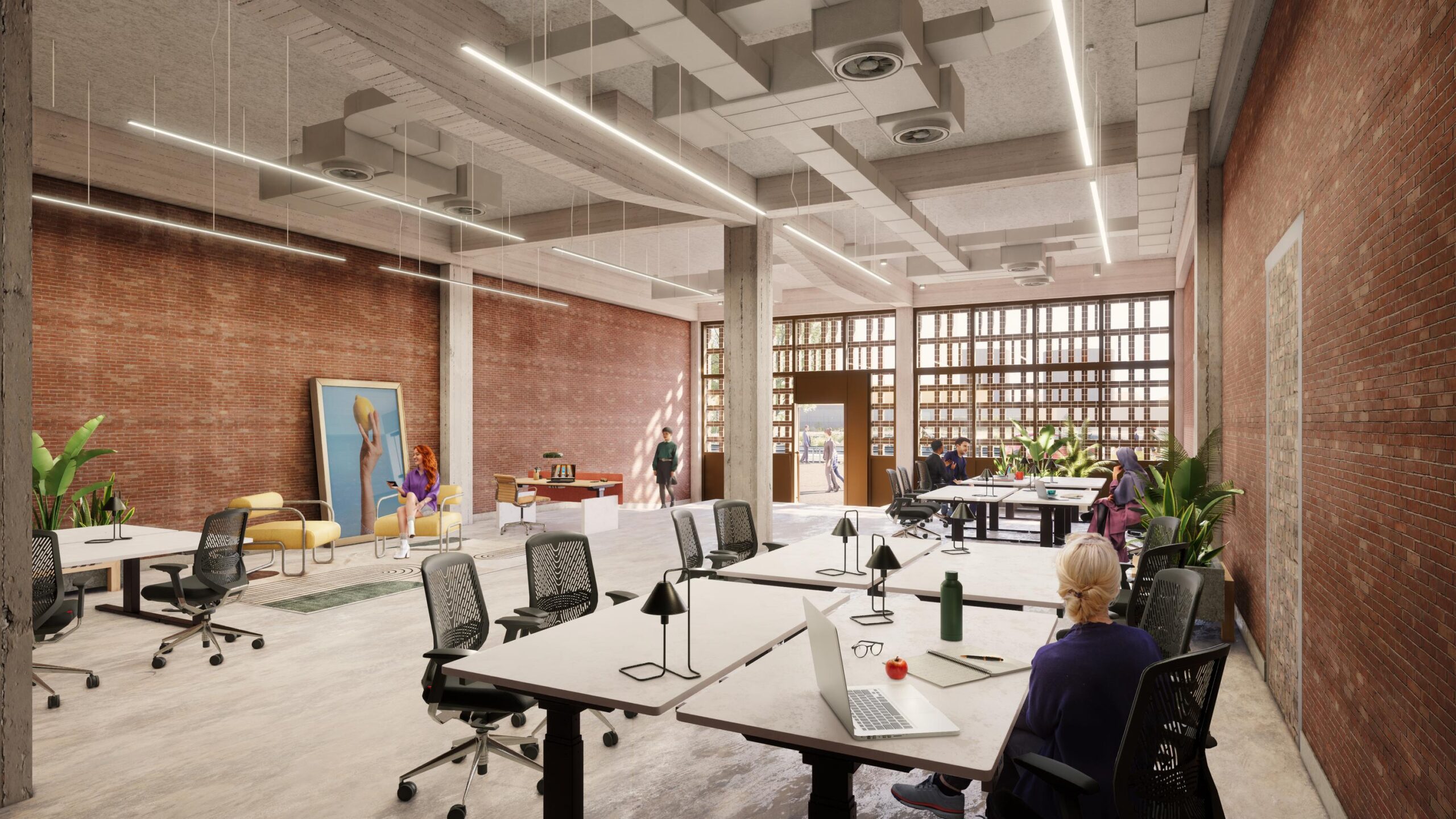 – akoestisch spuitplafond met industriële afwerking en installaties in het zicht;