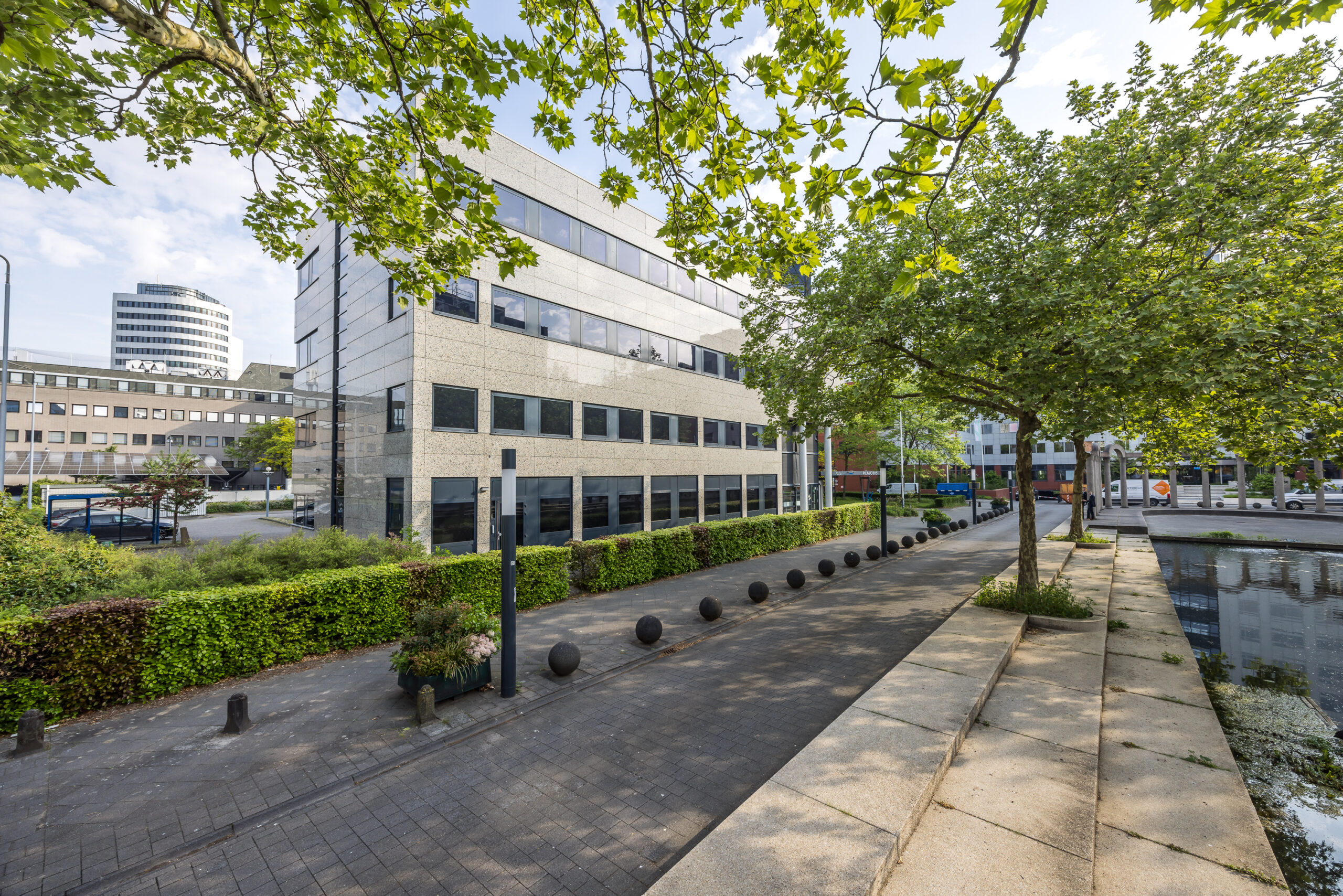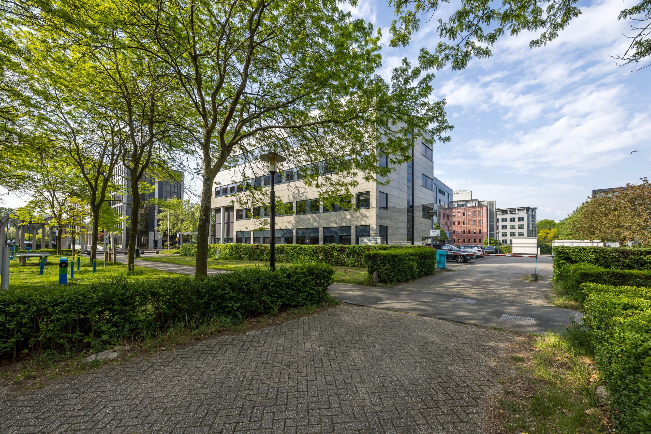 Op de begane grond is een ruime entree. Rondom het kantoorgebouw is een eigen parkeerterrein dat is afgesloten met een slagboom en een grote fietsenstalling.